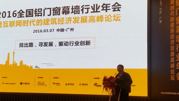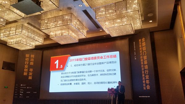然后是黄圻副秘书长的铝门窗幕墙行业工作报告“抢抓机遇 重降成本 融合发展——走创新与互利共赢之路”:对2015年铝门窗幕墙委员会的工作总结:一、宏观经济形势对门窗幕墙行业的影响;二、我国铝门窗幕墙行业发展基本情况;三、房地产对门窗幕墙行业的影响;四、近期相关政策出台对建筑幕墙的影响;五、成功举办第21届行业年会暨新产品博览会;六、发挥咨询职能,细化会员服务,创新工作方式。对2016年的重点工作项目,进行了介绍:一、协助企业研发和推广耐火完整性门窗;二、开展实施建筑门窗行业资格评定工作;三、编写《建筑门窗安装工职业技能标准》;四、筹备建立门窗幕墙团体标准体系;五、建筑铝结构应用研究;六、关于建立铝门窗行业诚信体系的意见。
