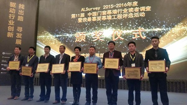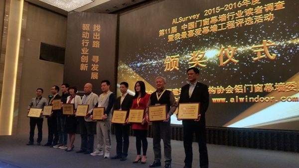 接下来是中国幕墙网开展的每年一届的门窗幕墙行业大型读者调查活动(简称“AL-Survey”)的颁奖仪式,“AL-Survey”至今已经连续成功举办十一届,已成为广大读者进行品牌选择和产品选购的重要参考依据。出席会议的协会领导和嘉宾分别为获得“用户选择奖”、“市场表现奖”、“十大品牌”的系统门窗、建筑胶、设备、隔热条企业、建筑玻璃、型材和五金配件企业,以及“我最喜爱幕墙工程”奖的工程项目和承建该工程的企业颁发奖牌。