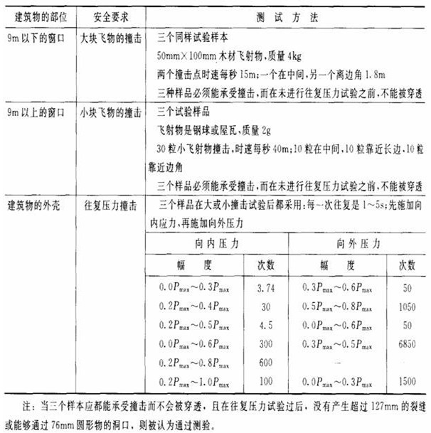 研究表明,当台风袭来时,在9m以下的窗口需能抵抗大块石块的击穿,在9m以上的窗口需能抵抗来自附近的瓦砾及其他小块杂物的冲击。通过一系列的测试对台风多发地区的外玻璃进行设计与选择,如表3—9所示: