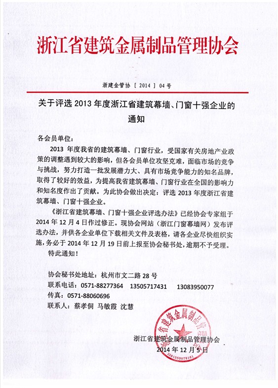 关于评选2013年度浙江省建筑幕墙、门窗十强企业的通知