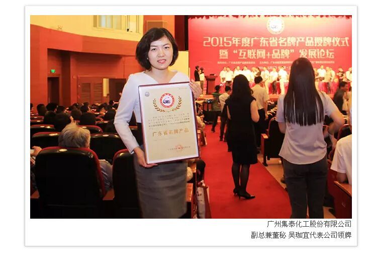广东省质监局、广东省工商局、海关总署广东分署等省名推委成员单位领导、各行业协会领导、各地市质监局分管领导、2015年“广东省名牌产品”获奖企业负责人共600多人出席了本次会议。广州集泰化工股份有限公司副总经理兼董事会秘书吴珈宜代表公司出席了此次授牌仪式。