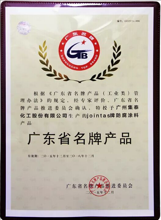 5月3日下午,2015年度广东省名牌产品授牌仪式暨“互联网+品牌”发展论坛在广州珠江宾馆会议中心礼堂隆重举行。在仪式上,广州集泰化工股份有限公司旗下集泰防腐涂料产品继2012年第二次被授予“广东省名牌产品”的称号。经过层层把关和多轮角逐,共有593个产品被评为2015年度广东省名牌产品。